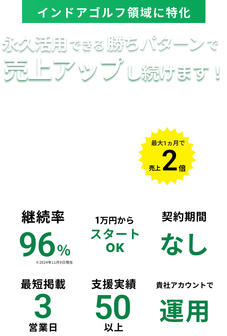 インドアゴルフ業界に特化してWeb集客を行っております。 業界に特化して数多くのお客様を担当していることで最新トレンドが分かり 最も効率よく集客をすることが可能となります。