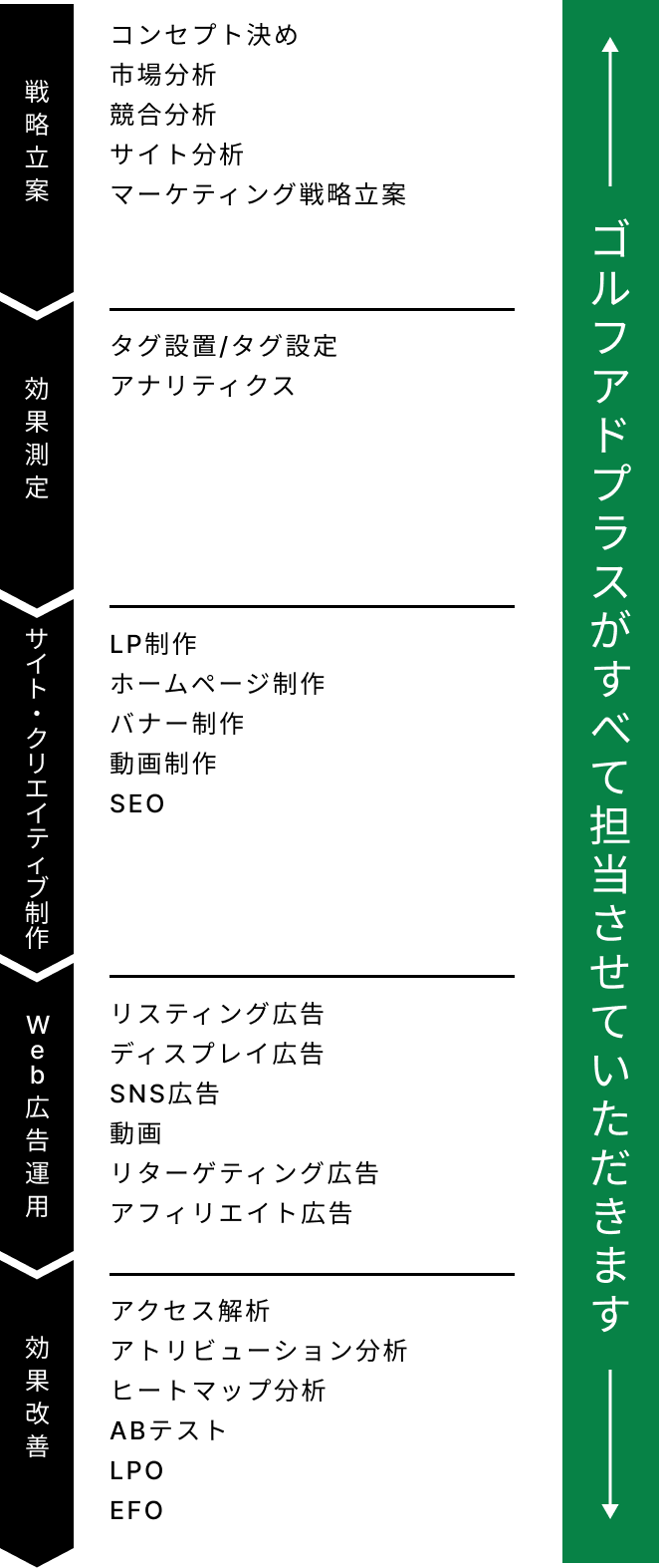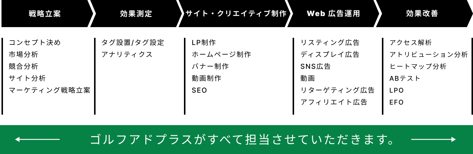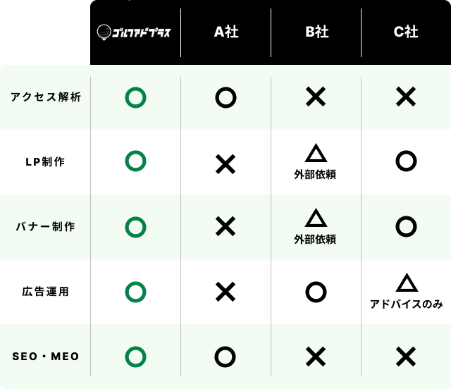 ゴルフアドプラスはwebに関する様々なことをトータルでサポートいたします。そのためweb広告の運用はもちろん、web制作やタグの効果計測も可能です。