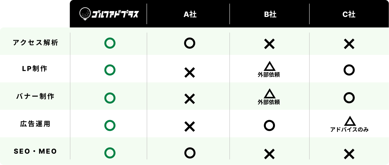 また、将来的に社内で運用することを考えている貴社にとっては、ゴルフアドプラスで運用した広告アカウントを引き継げるというメリットもあります。