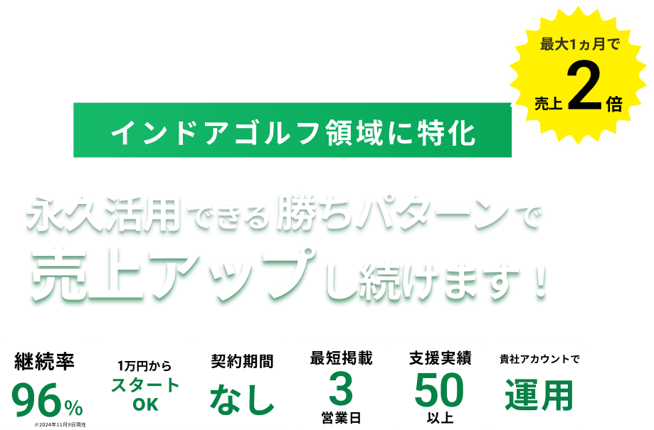 インドアゴルフ業界に特化してWeb集客を行っております。 業界に特化して数多くのお客様を担当していることで最新トレンドが分かり 最も効率よく集客をすることが可能となります。