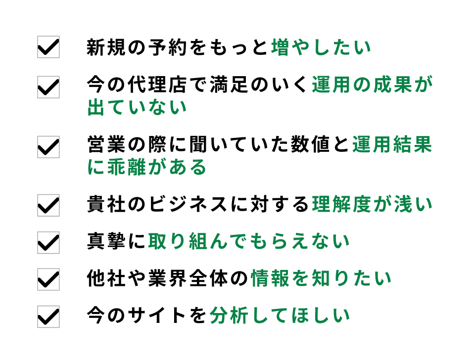 営業を受けていた際にシミュレーションで聞いていた数値と、実際の運用結果の数値に乖離があるにも関わらず、見栄えのいい数値だけ切り出して報告してくる代理店もあります。このような代理店は効果を改善するための手段を持ち合わせていない可能性がありますので乗り換えの検討をお勧めします。